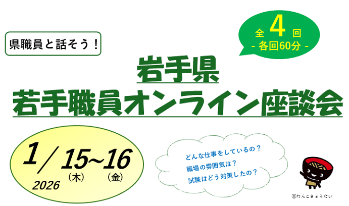 - 【申込受付開始】「岩手県若手職員オンライン座談会」の申込受付を開始しました。詳細は「説明会・インターンシップ情報」(クリックで該当ページを開きます。)をご覧ください。