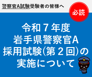 警察官A(男性) | 岩手県 | 令和7年4月1日現在の年齢が35歳未満の男性 | 次のいずれかに該当する者 ①大学(短期大学を除く。)を卒業した者又は令和8年3月31日までに卒業する見込みの者(大学から卒業見込証明書が発行される者) ②これらの者と同等の資格があると人事委員会が認める者 |