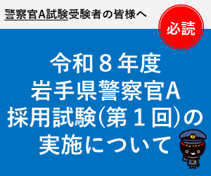 | 警察官A(男性) | 岩手県 | 令和8年4月1日現在の年齢が35歳未満の男性 | 次のいずれかに該当する者 ①大学(短期大学を除く。)を卒業した者又は令和9年3月31日までに卒業する見込みの者(大学から卒業見込証明書が発行される者) ②これらの者と同等の資格があると人事委員会が認める者 |