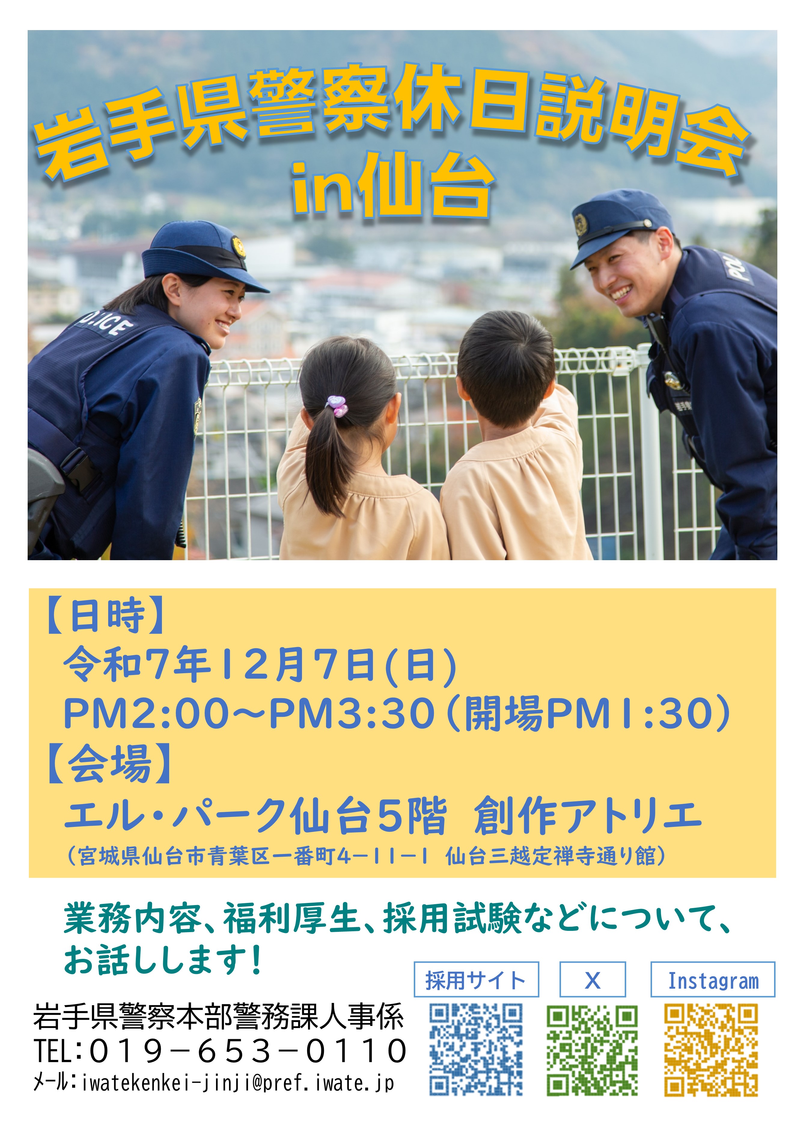 岩手県警察本部警務部 警務課 採用担当〒020-8540 岩手県盛岡市内丸8-10電話番号:0120-204034